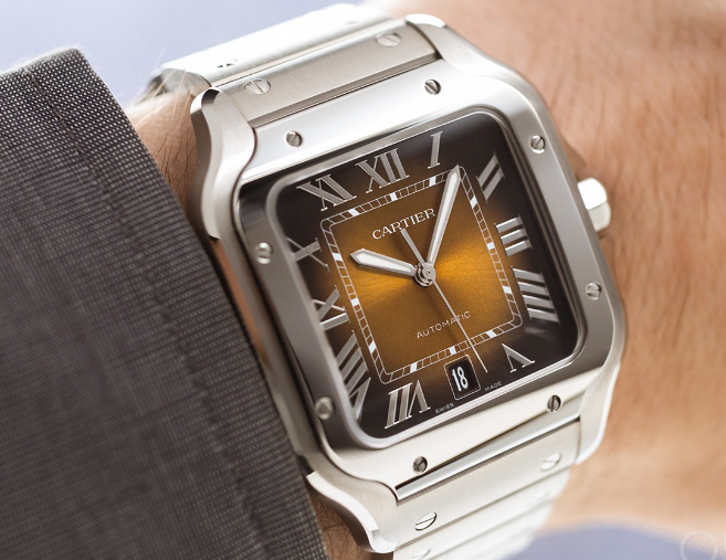 腕表点评:卡地亚山度士腕表,起源于卡地亚专为他的好友巴西飞行家山度士专门设计,以便于他在飞行过程中读时。这系列山度士表款发展到至今,独特的方壳元素设计,再加上卡地亚为其使用了许多现代的元素设计,让腕表更具美感的同时也使其成为了方表中的一大标志。这两年卡地亚对于常规款式山度士的塑造,是推出了不少挺有个性的彩色盘面,像年初这款棕色盘面,本身棕盘在腕表领域的应用就不算多,挺特立独行的,卡地亚还在细节上下了不少功夫,做了缎面处理跟渐变设计,让这抹棕,更加耀眼。新表我也更建议大家选择39.8毫米,是山度士中的大号尺寸,大一点,也确实让棕色盘面的表现力也就更突出一些。表侧七角形表冠上镶嵌一颗蓝色多切面合成尖晶石,黑色表盘上配有罗马数字刻度与剑形指针,6点钟位置还有日期显示窗口。腕表搭载一枚卡地亚1847 MC型工作坊精制自动上链机械机芯,防水性能达100米。