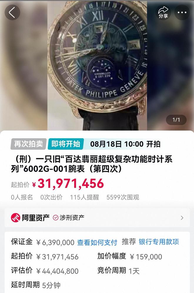 除了别墅,在18日上午,深圳市中级人民法院还将对2只涉及刑事案件的百达翡丽腕表进行拍卖,其中,名称为“(刑)一只旧‘百达翡丽超级复杂功能时计系列’6002G001腕表(第四次)”的评估价4400多万元,起拍价3197万余元,保证金639万元,加价幅度为15.9万元,竞价周期为1天。