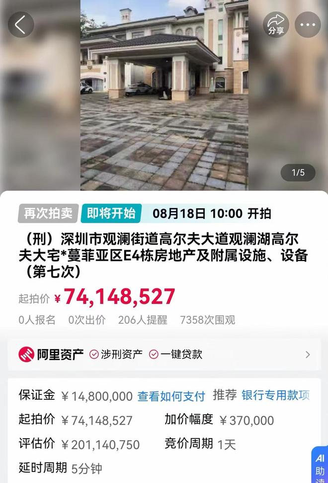 2023年8月28日至8月29日,深圳市中级人民法院在淘宝网司法拍卖网络平台,对深圳观澜湖高尔夫大宅*蔓菲亚区E4栋房地产及附属进行第一次公开拍卖,起拍价为2.01亿余元,当时被称为“深圳法拍最贵住宅”。时隔近两年,该房产及附属设施、设备将第七次拍卖,起拍价降为7414万余元,减少了近1.3亿元。