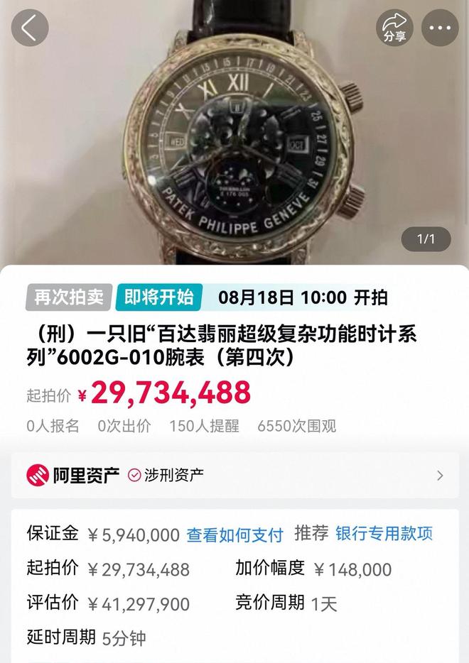另一只百达翡丽的名称为“(刑)一只旧‘百达翡丽超级复杂功能时计系列’6002G010腕表(第四次)。”评估价4129万余元,起拍价2973万余元,保证金594万元,加价幅度为14.8万元,竞价周期为1天。