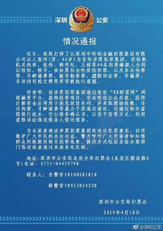 2019年4月10日,深圳市公安局通告称,打掉了以深圳中科创金融控股集团有限公司法定代表人张伟为首的涉黑犯罪集团。据悉,该涉黑犯罪集团通过架设“88财富网”网络融资平台,虚构投资项目,非法吸收公众存款,获得巨额资金后再用于高息放贷牟利,并采取摆场收数、非法拘禁、寻衅滋事等暴力手段逼迫催收。