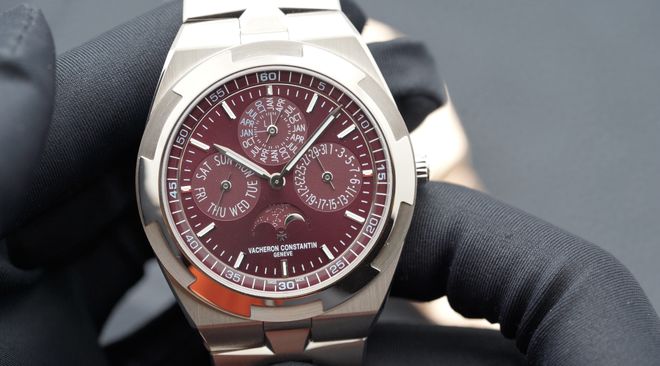 还是那个直径41.5毫米,厚度8.1毫米的表壳,一款是18K白金材质搭配勃艮第红色盘面,另一款采用18K 5N粉红金,搭配同材质表盘。
