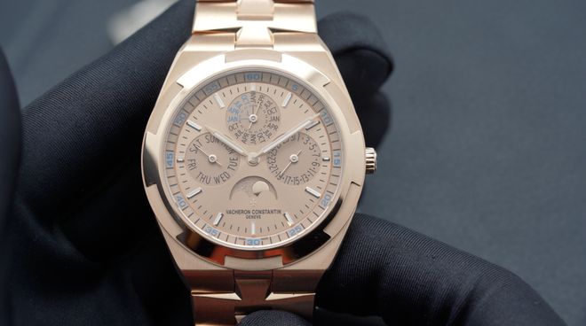两款全新配色,总体上我个人更加青睐统一色调的粉红金款。金色本身就足够亮眼大气,加上表壳表链盘面全粉红金配置,会更加适合亚洲人肤色,说白了就是显人白。