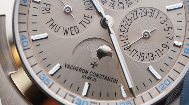 表盘配置上和老款没有变化,12点位置是月份和闰年显示,3点为是日历,6点位是月相,9点位是星期。盘面信息规整,也是最为经典的万年历信息展示方式。月相盘是和表壳相对应的同款贵金属材质,盘面上精细地雕刻了月球和星座。