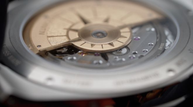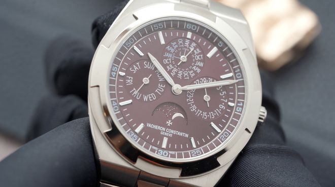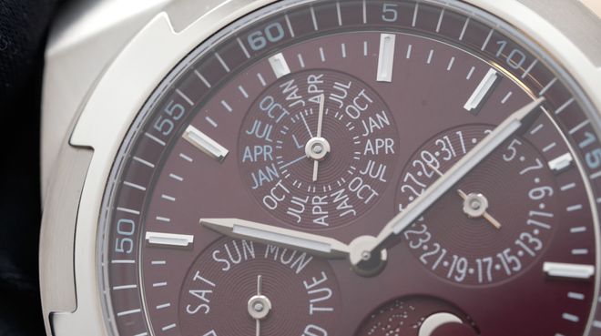而腕表内部搭载的是江诗丹顿自产机芯Calibre 1120 QP。这个具备了万年历和月相功能的自动上链机芯,由276个零件组成,包含36颗人造宝石轴承,总体厚度仅有4.05毫米。