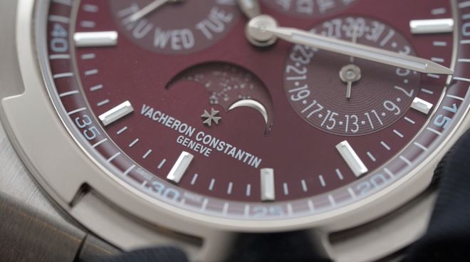 而18K白金和勃艮第红就是高对比度的组合了。冷峻的白色和炙热的红色,月相盘中的月亮也更明晃晃,属于沉稳老派的气质。