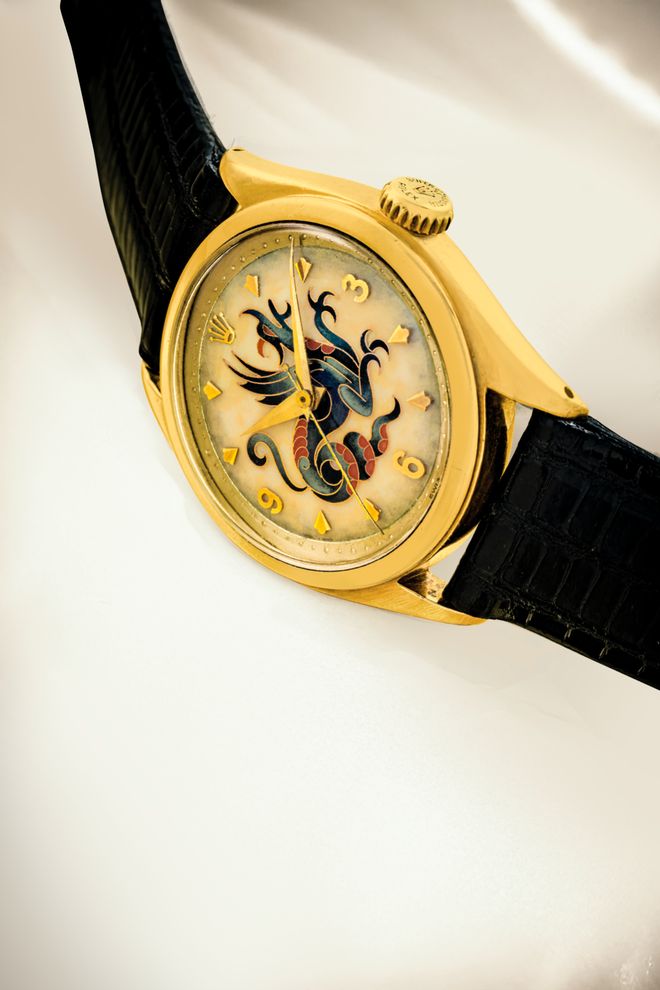卓越、重要及极罕有,18K金自动上弦腕表,配珐琅表盘描绘龙,型号6100,约1954年制,附原厂证书、盒子及外包装