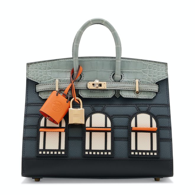 罕见雾面水泥灰色短吻鳄皮,白色TOGO, SWIFT及SOMBRERO小牛皮,橙色及奶昔白色SWIFT小牛皮及雾霾蓝色CHÈVRE山羊皮20公分外缝雪白FAUBOURG柏金包附钯金配件