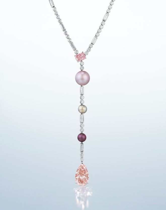 4.62克拉梨形浓彩橘粉红色VVS2钻石、1.12克拉长方形浓彩粉红色VVS1钻石及天然珍珠吊坠项链