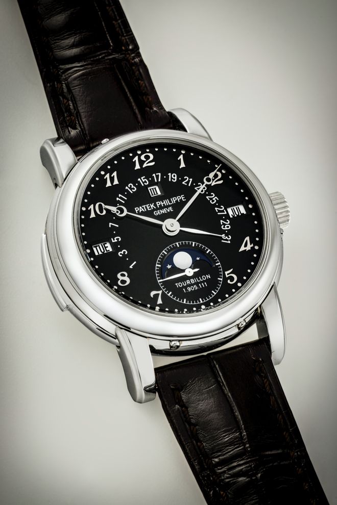 极罕有,铂金三问万年历腕表,配陀飞轮、逆返日历、月相显示及黑色表盘配宝玑数字