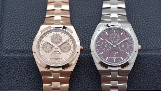 这次最大的改变,就是全新的色系搭配。18K白金搭配勃艮第红表盘,18K 5N粉红金搭配同色表盘。