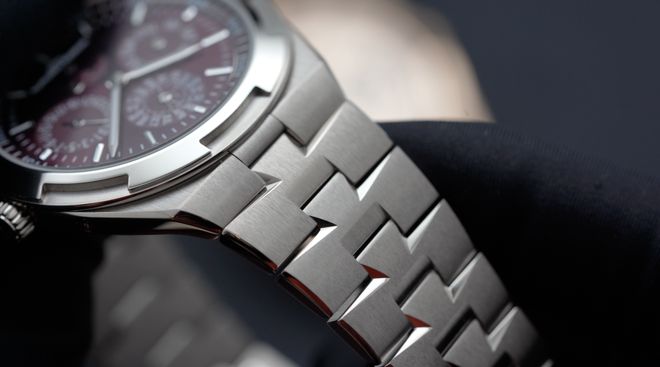 同时作为表壳表链一体式高级运动休闲风腕表,新款纵横四海的表链也相当有特色,它并不是传统的三节式表链,而是融入了江诗丹顿标志马耳他十字元素,形成类似“凸”字结构的造型,并利用缎面打磨和镜面抛光修饰,辨识度极高。表链纤薄,与腕表中壳延伸出的表耳厚度一致。