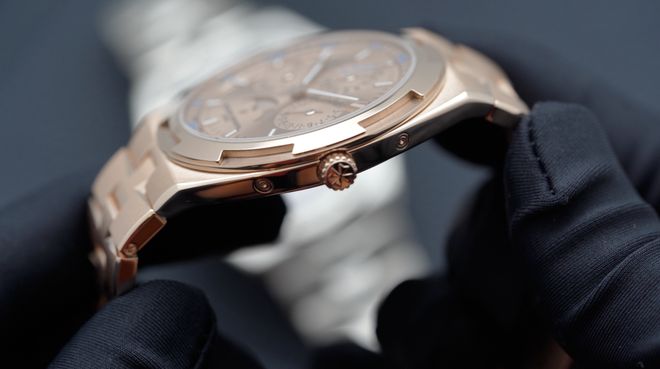 两款全新配色,总体上我个人更加青睐统一色调的粉红金款。金色本身就足够亮眼大气,加上表壳表链盘面全粉红金配置,会更加适合亚洲人肤色,说白了就是显人白。